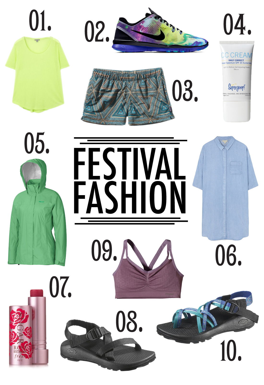 Which leads to my picks for this so-called “festival fashion” thing. Anything lightweight, quick-drying, or easy to clean are ideal. Both the COS t-shirt and dress are made from lyocell, a fabric which absorbs perspiration at a rate of 50% more than cotton and quickly releases it into the atmosphere. Similarly, the Patagonia shorts are breezy, water-repellent, and feel wonderful against the skin, even after a scorching hot summer day (same goes for their Barely Bra). Rain jackets are a must, not just for soggy days but also to keep you warm at night, and this Marmot jacket, which comes in almost two dozen colors, excels at both. Your footwear choice can make or break your festival experience. If you’re attending a non-camping festival like Lolla or Osheaga, go with some Nike Frees—or “cloud pillows for your feet,” as I often call mine. However, if you’re attending a camping festival like Bonnaroo, get some Chacos. They’re sturdy, have excellent arch support, and are a breeze to clean after four days of tromping around in dust, mud, and festival sludge. Personally, I’m a no-toe-strap kind of gal, but if your big toe needs the extra security, I won’t hold it against you. And last but not least, don’t forget your SPF. Supergoop! CC cream is a great all-in-one for your face, and a touch of Fresh Sugar Rose on your lips will make you look somewhat put together, even though you haven’t showered in almost a week.